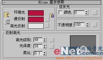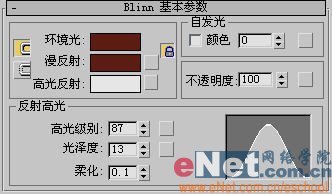 1、点击工具栏上的“材质编辑器”按钮,打开其面板,选择第一个样球,调整环境光的颜色设置及反射高光值,如图11所示。
