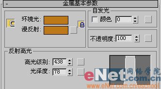 4、选中第三个样球,在“明暗器基本参数”卷展栏中设为“金属”,调整环境光、反射高光等值,将它赋予圆环,如图13所示。