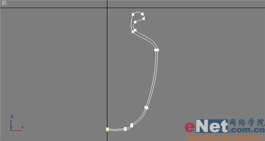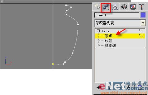 2、点击“修改”命令面板,打开“Line”的下级项选择“顶点”。右键线条的每一个顶点,将其定义为bezier后分别用“选择并移动”工具进行调整,使其外形如图2所示。
