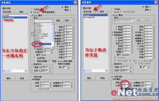 7、选中Rectangle01,单击“修改器列表”下拉框中的“cloth”项,打开“对象”卷展栏,单击“对象属性”按钮,为其配备丝绸效果,并添加另一冲突对象Line01,修改冲突属性,如图7所示。