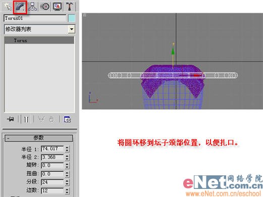 8、点击“创建”命令面板中的“几何体”按钮,进入其创建面板,点击“圆环”按钮,在顶视图中绘制一圆环Torus01,调整其尺寸,并和坛子进行X、Y轴上的中心对齐,如图8所示。