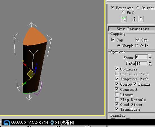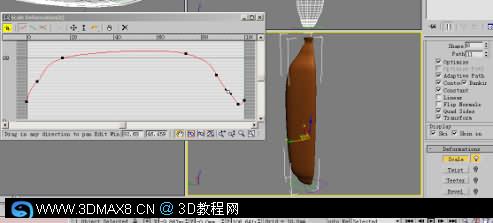 只所以选择用直线而不是香蕉的弧线型来放样,主要就是为了以后的贴图准备的.而且在MAX里面对于路径上的截面图形可以自由放缩比例的.这点确实比较方便