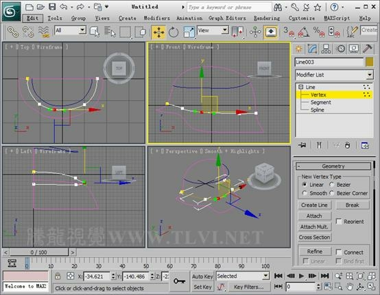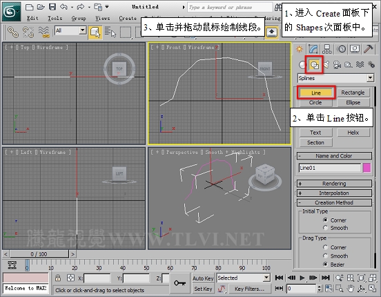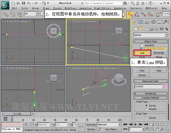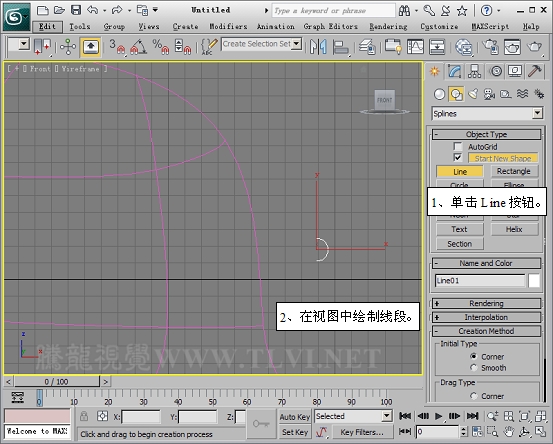 (1)首先运行3ds max 2011,然后在Front视图中绘制线段——Line001。