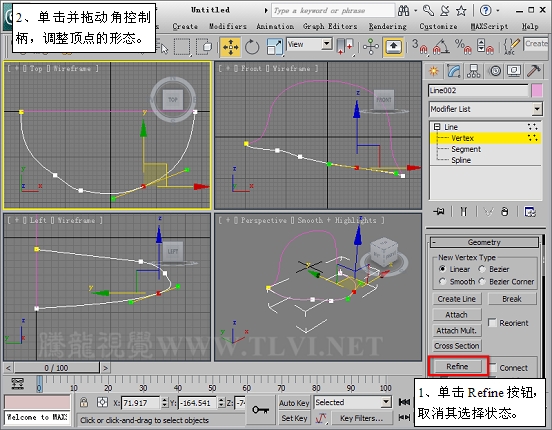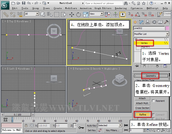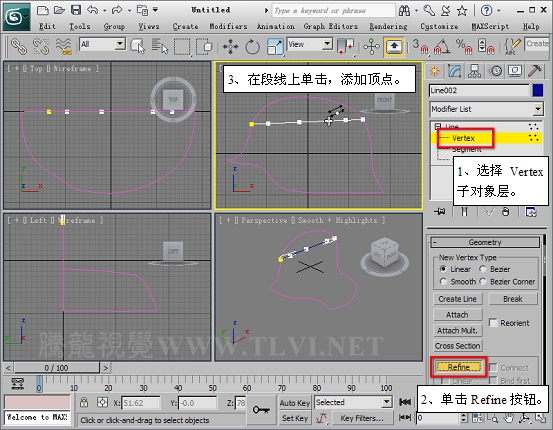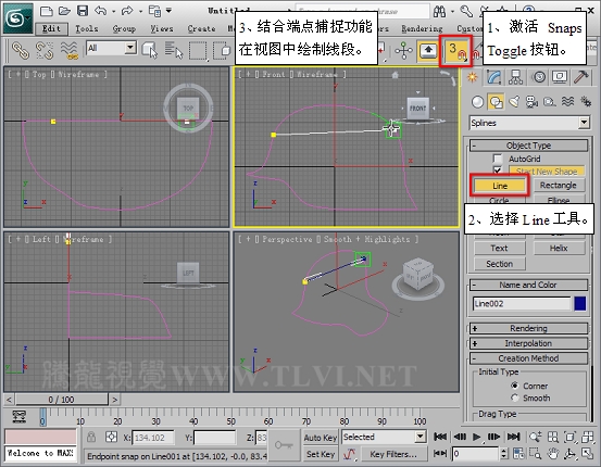 Snaps Toggle按钮。选择Line002对象并为其添加顶点。