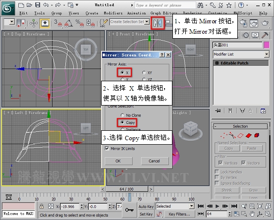 (17)在Left视图中选择“头盔”对象,并将其镜像复制,复制的对象名称为“头盔001”。