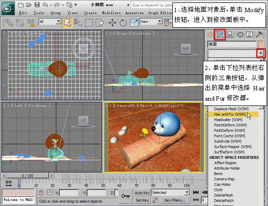 (2)首先需要创建草的效果,在场景中选择“地面”对象,并为其添加一个Hair and Fur修改器。