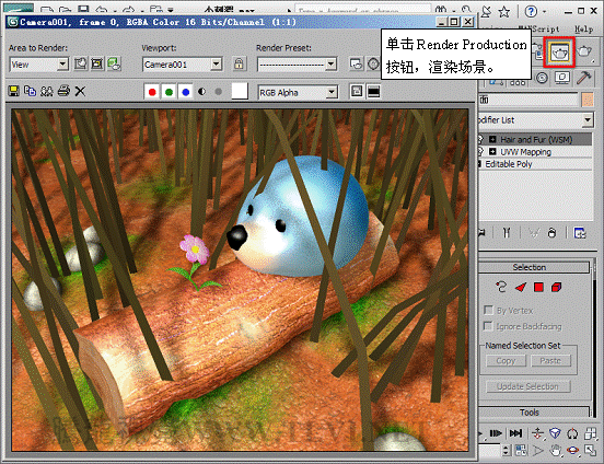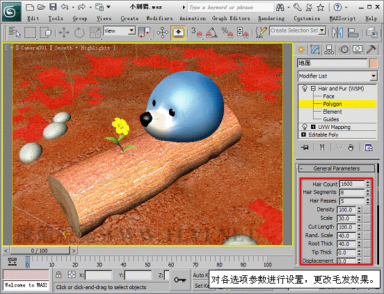 (3)添加Hair and Fur修改器后,对象表面会自动生成毛发,毛发的效果在渲染后才能看到,渲染Cameras001视图,可以看到毛发效果。