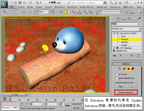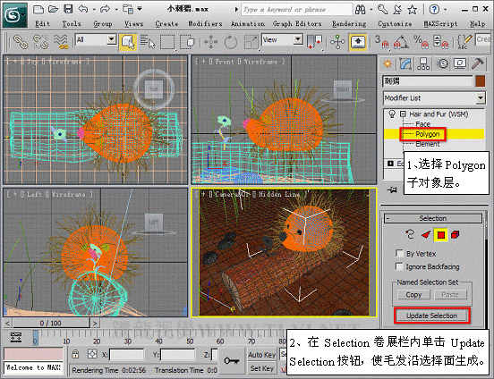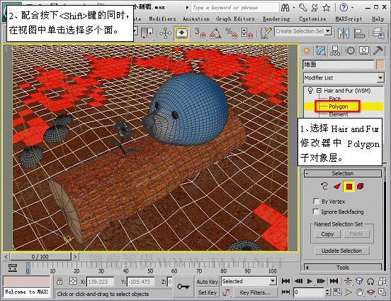 (12)进入Polygon子对象层,并使毛发沿指定面生成。