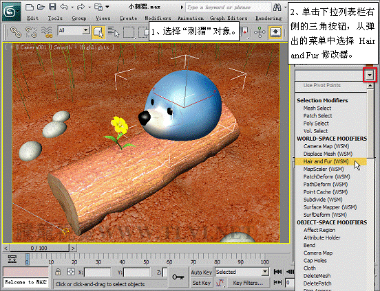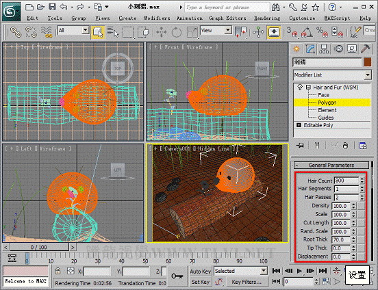 (11)接下来需要设置刺猬身上的刺,首先退出Polygon子对象层,然后在场景中选择“刺猬”对象,为其添加一个Hair and Fur修改器。