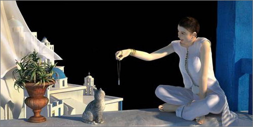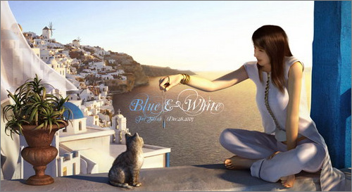 那以她的性格,结合了当时的环境,她应该会做什么呢?在这一点上我做了许多的尝试,也推翻了许多次。后来我忽然想起爱琴海有许多小猫,因此我决定加入这一元素,用蓝色的项链把她跟小猫联系起来,让Sarah跟小猫玩耍。