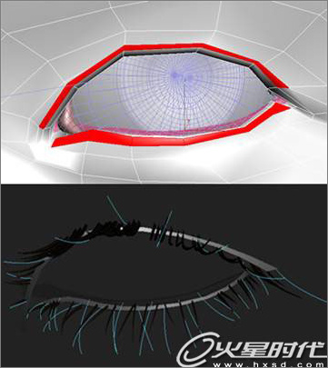 我选中了眼睛附近的一圈面,Detach了出来,并以它为发射体,用Hairfx做出了上下睫毛。