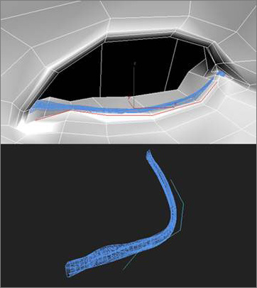 然后选中了下眼皮上的一圈线,用Create Shape From Seletion创建出了一根线,并把它转换成 Polygon,给与了水的材质,用以模拟眼睛边缘。