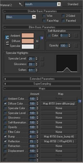 然后用一张mask,划分出嘴唇部分,并给与另外一个带反射的材质,最后把他们用Blend材质球整合到一起。