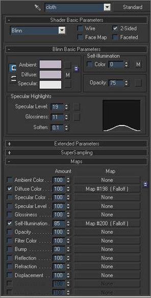 至于衣物的材质部分,当我完成了它们的Diffuse贴图之后,我使用了Falloff以及自发光来模拟衣物的质感,并把透明度降低至我满意的程度。