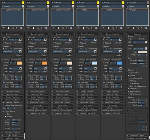 灯光 场景中我使用了6盏灯,具体分布以及参数如下。
