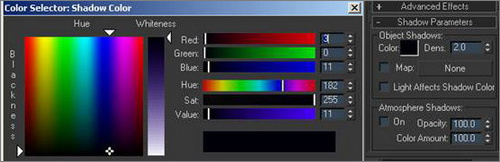 主光我使用的是Vrayshadow,并打开了Area Shadow选项,然后我把阴影的颜色调整得稍微偏紫了一些,并把Dens.值改为2。