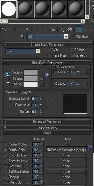 我切换到了Mentalray渲染器,把其中一个材质球的自发光开到100,然后在diffuse通道里添加Ambient/Reflective Occlusion(base),并把数值调整如下。