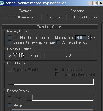 然后打开Render Scene面板,在Processing页里勾选Material Override(材质代理)的Enable,并把刚才的材质球关联复制到旁边的Material栏里。如此一来,渲染器便会把场景里所有的物体,都用刚才指定的材质渲染。
