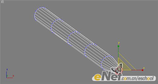 3、点击“创建”命令面板中的“几何体”按钮,进入其创建面板,点击“圆柱体”按钮,在视图中绘制一圆柱体Cylinder01,并进入“修改”命令面板,在“修改器列表”中选择“编辑网格”项,调整前端的顶点,作为烟的实体,形状如图3所示。