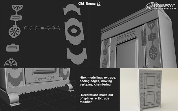每一个装饰物都是用样条线制作(我会经常用线、弧线、多边形)。首先我画了基本外形,一旦我得到它,我会经过细致的调整,然后在使用挤出工具成为形。