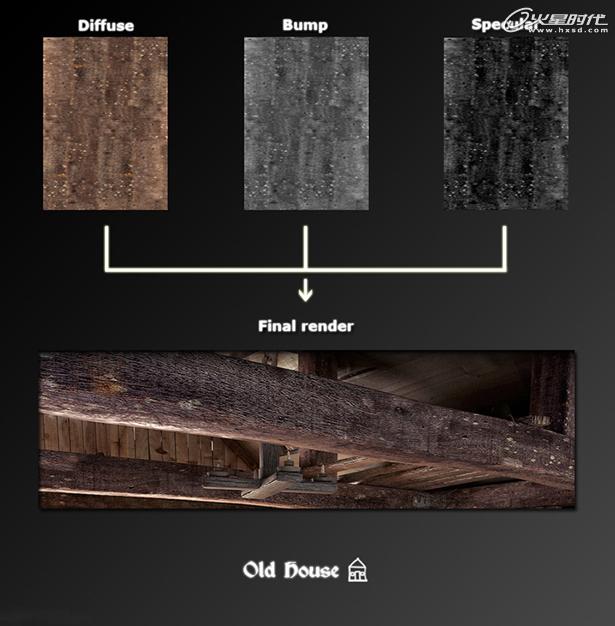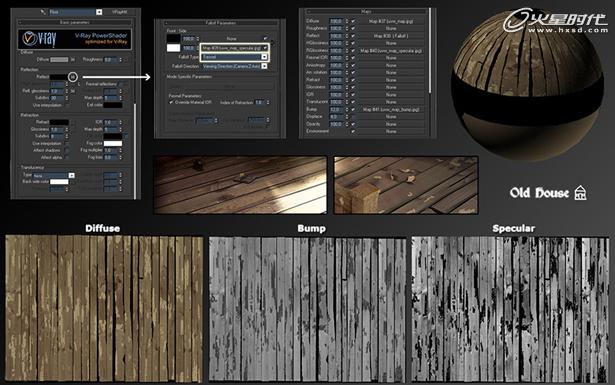 正如你看到的第一张图片,地板是由三张不同的纹理进行制作的:首先我们需要一个漫反射贴图给它一个颜色。我一直再寻找有一点暖一点的颜色让现场看起来舒适一些。Bump必须添加进去,让地板看起来有裂痕和经常使用的感觉。第三,我不但不使用镜面贴图控制地板的反射。因为,这是一个老旧的房子,地板是不能有很强的反射的。