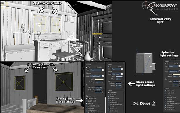 我只使用了VRaylight这一种灯光。主要的想法是,模拟出从窗户射入强烈的太阳光射线。要做到这一点,我把VRaylight放置到房子的北面。把它设置为球形灯光,让它看起来像太阳。重点要记住把它设置为球形,因为在默认的平面模式下,光线照射只会在一条直线上。