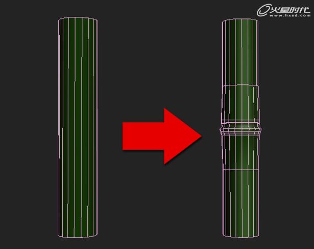这时给模型一个UVW Mapping修改器,选择Cylindial类,之后复制出几段,Attach到同一个物体之后再把每段焊接上,一根竹子的模型就基本完成了。(图03)