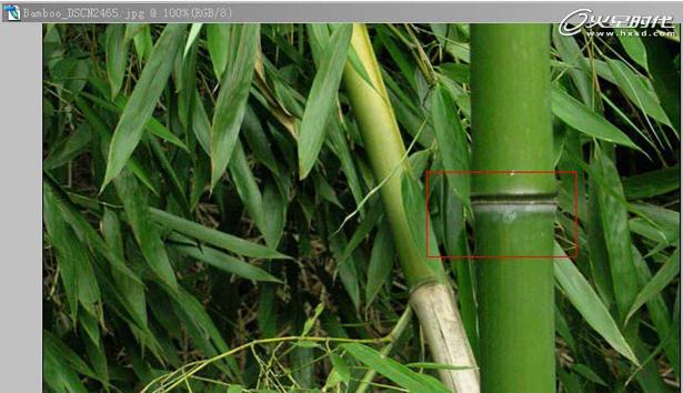 接下来从下图内红框部分,取出素材,并配合着使用动态模糊、风、锐化等滤镜,以做出竹子上面一丝丝的纹理。(图19)