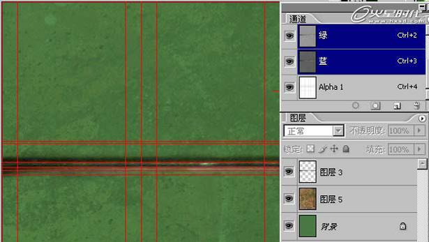 用橡皮擦擦拭掉多余的部分之后,点击Alpha1通道前面的眼睛图标,打开UV信息,将竹节素材对准至横线较多的位置,效果如下图。(图17)