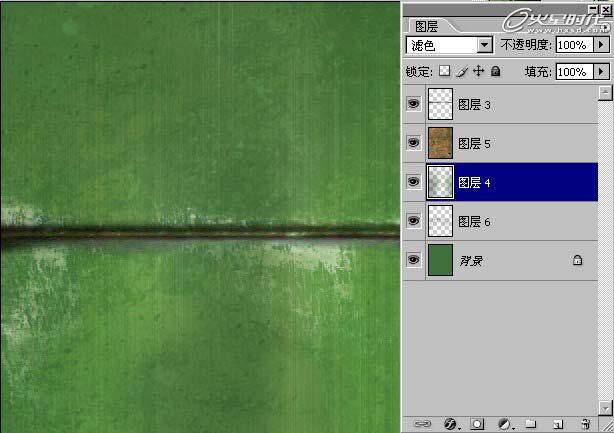 先用绿色填充图层,并把上图中的墙面贴图用叠加方式叠在图层上,填充设置成25%。效果如下。(图15)
