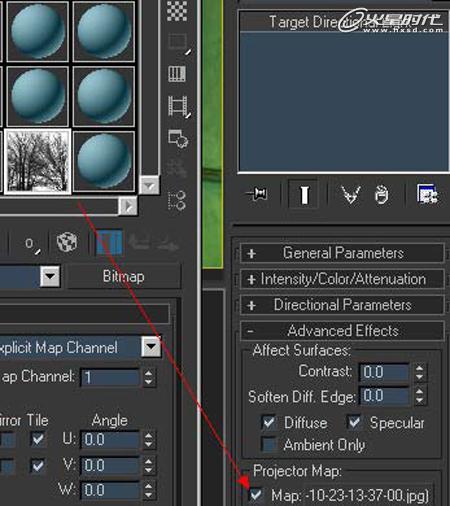 把这张贴图导入到材质编辑器,并关联复制至主灯的Projector Map框内,如下图所示。(图40)
