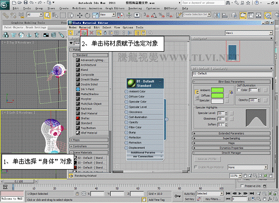 (6)将当前编辑的材质赋予场景中的“身体”对象。