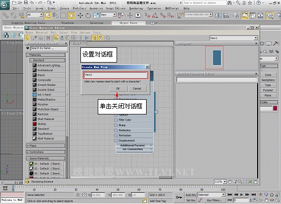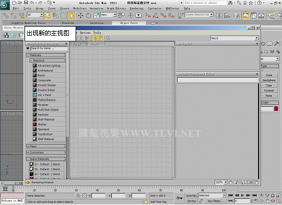 提示:如果不创建的视图,也可以继续在主视图编辑材质,但是过多的材质会使视图很杂乱。为了便于观察和管理,可以选择01 Default面板,在键盘上按Delete键,删除该面板,然后在主视图中继续其他编辑材质。