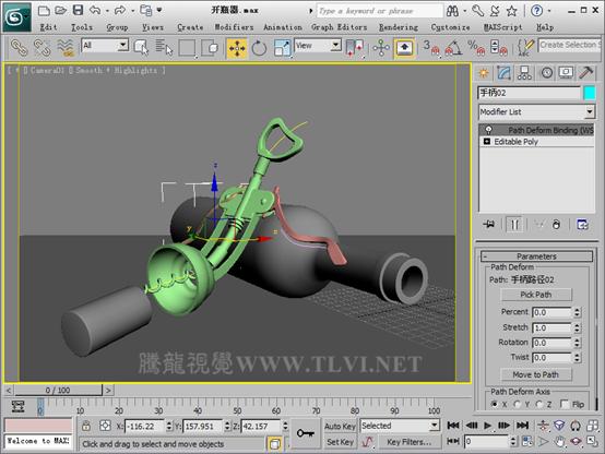 (7)在Parameters卷展栏内激活Pick Pith按钮,然后在场景中单击“手柄路径01”对象。然后使模型沿X轴适应路径。