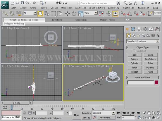 (1)运行3ds max 2011,打开素材“步枪.max”文件。