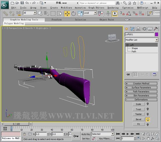 (16)在Skin Parameters卷展栏下选择Skin复选框,恢复蒙皮的显示,可以看到放样对象的形态。