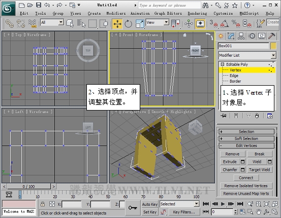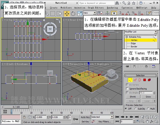 (4)进入该对象的Vertex子对象层,在Top视图中编辑顶点。