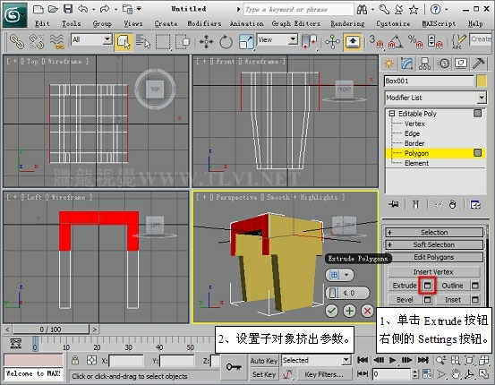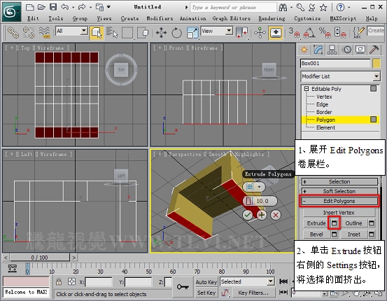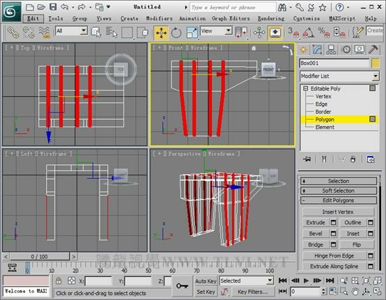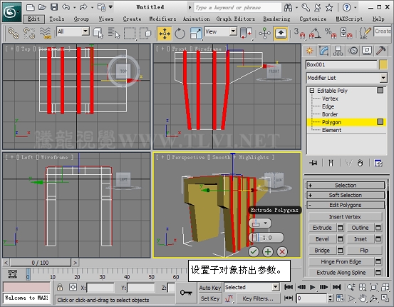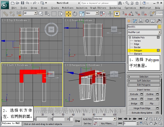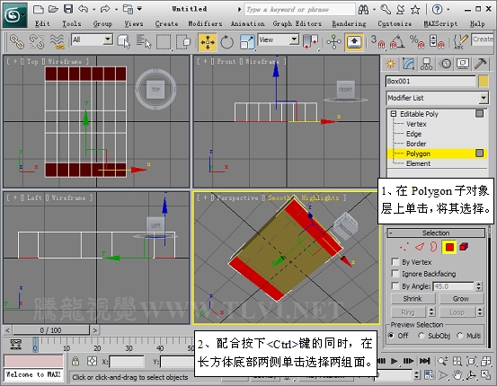 (5)进入Polygon子对象层,在Perspactive视图中选择长方体底部两侧的两组面。