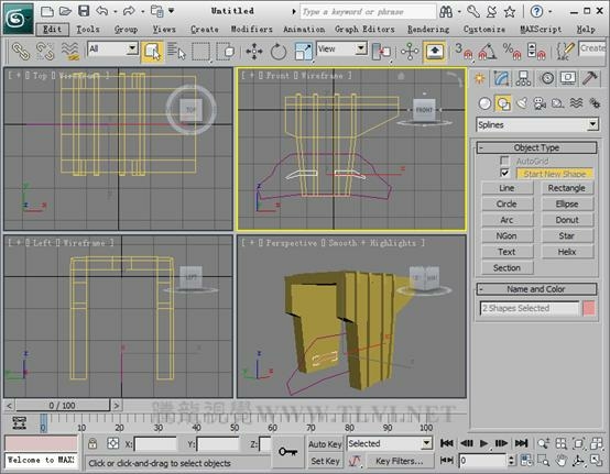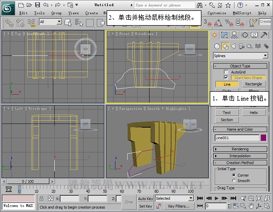 Shapes次面板,单击Line按钮,在Front视图中绘制线段——Line001。