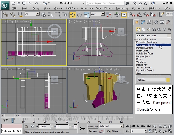 Geometry次面板,在该面板下的下拉式选项栏内选择Compound Objects选项。