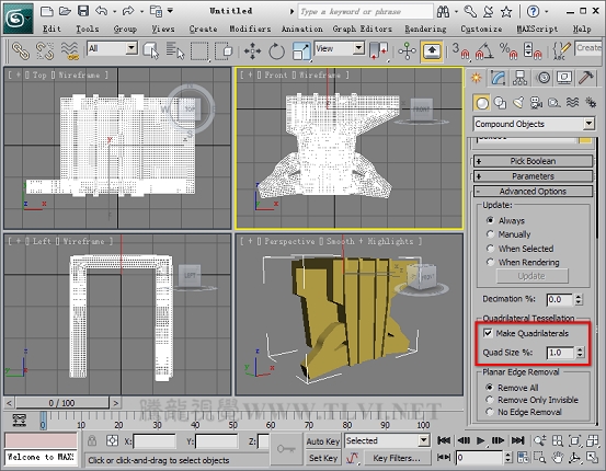 提示:启用Make Quadrilaterals时,会将布尔对象的镶嵌从三角形改为四边形,虽然在未使用MeshSmooth修改器的情况下,这一效果并不明显,但在布尔对象改为四边形后,才可以形成平滑的圆角边,三角形则不可以。