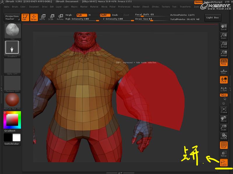 按住ctrl+shift拖动鼠标来选取你想要或者想隐藏掉的部分(ctrl+shift拖动鼠标时放开shift建就可以成红色选区,被红色选区选中的物体会被隐藏掉)。(图07、08)