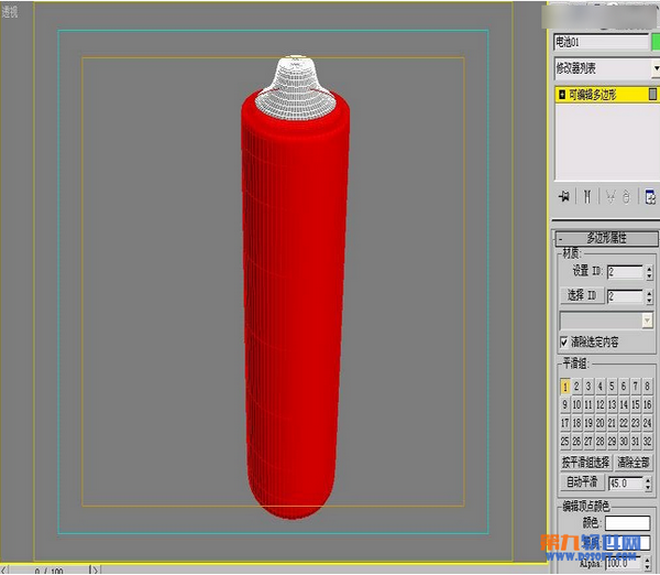 (1)首先,我们来分析一下材质的制作特点。观察电池,发现首先电池是由头部和身体两部分组成的。头部是磨砂金属材质,而身体部分是由黄金材质和贴图反射材质混合而成。因此首先在大方向上要确定总材质级别为多维子材质。ID号为1的是磨砂金属,而ID号为2的是一个Blend混合材质,是由黄金材质和贴图反射材质混合而成。因此第一步要为对象设定表面材质的ID号,可以通过将模型转为多边形或网格模型来完成。由于电池直接是由可编辑多边形制作完成,因此可以直接设置材质的ID号。这部分内容比较简单,由读者自行去设定完成,我仅以一个电池为例来给出一张表面ID设置图,效果如图。