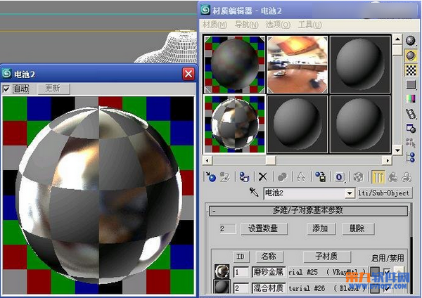 (2)将电池的材质类型设为多维子材质,设置ID号的数量为2个。将一号调节为磨砂金属材质,而将2号暂时设定为一个Blend材质,待会有待细调。材质设定效果如图所示。