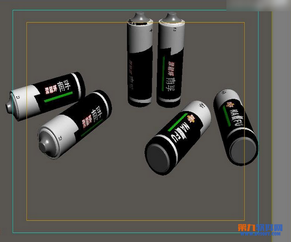 而遮罩的设置只须直接将遮罩图贴入通道就可以了,这里就不说明了。对场景中的所有电池赋予所设定的材质,场景显示效果如图22-9所示。如果你设定的效果与图示不一样,只需要对电池的2号选区施加一个UVW Map贴图坐标修改器就可以了,具体参数请大家自己独立完成。
