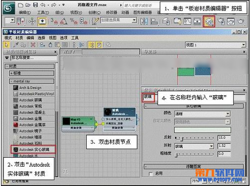 (3)打开“板岩材质编辑器”对话框,将“Autodesk 实体玻璃”材质添加至活动视图,并重命名。