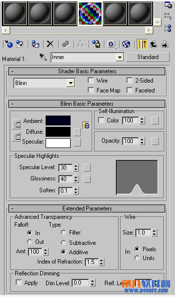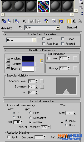 环境色设为黑色,漫反射设为蓝色,高光设置为纯白色。其它参数看以上图示。