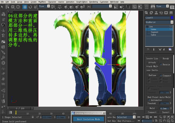 制作之前我们要思考,这武器是左右及前后都是对称的,所以我们只需要制作它的4分之1就可以。其次就是关于它的材质,其实可以遵循不同材质不同模型分开来制作,为后来绘制UV避开障碍。所以我这里使用模型分开建立的方法。用二维线绘制,如图所示的闭合线段,调节各点的位置,尽量准确。(图02)