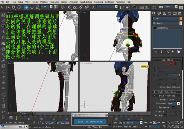 根据理解调整面与面之间的关系。注意前后与转折。在理解的基础上应该很好把握。利用点面合并,建立如图所示的刀把大致的模型。到这里武器的4个主体部分算是完成了。下面做小部件。(图13)