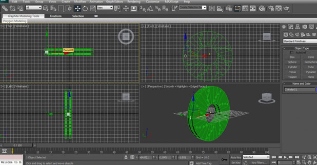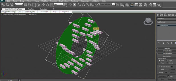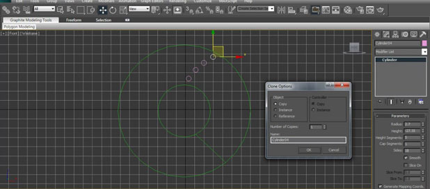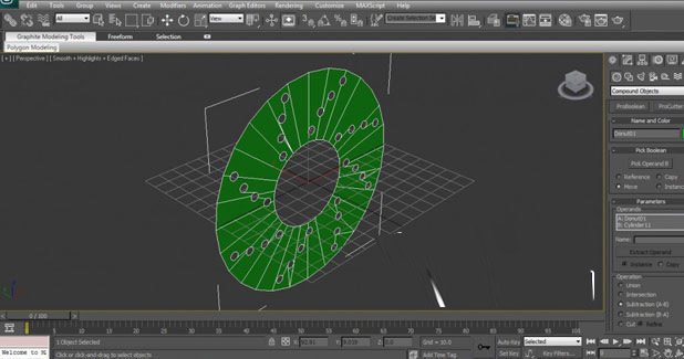 使用复合对象的Boolean功能(检查右边菜单),选择Subtraction操作,考虑到圆柱体处于选择状态,你要计算出线圈多边形,线圈多边形上面会有很多洞,如图所示: